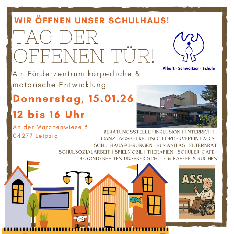 Wir sind eine Ganztagsschule in Leipzig-Marienbrunn mit dem Förderschwerpunkt körperliche und motorische Entwicklung. Bei uns lernen ca. 220 Schülerinnen und Schüler in kleinen Klassen von Klasse 1 bis Klasse 10. Unsere Schule gliedert sich in einen Grund- und Oberschulteil sowie einen Schulteil zur Lernförderung und bietet durch den Freistaat Sachsen geförderte Ganztagsangebote (GTA) an.